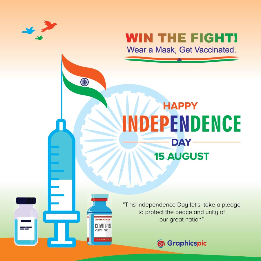 Happy independence day 15 August and vaccination concept with tricolour flag, vaccine injection and typography win the fight against corona virus covid 19 pandemic – free vector