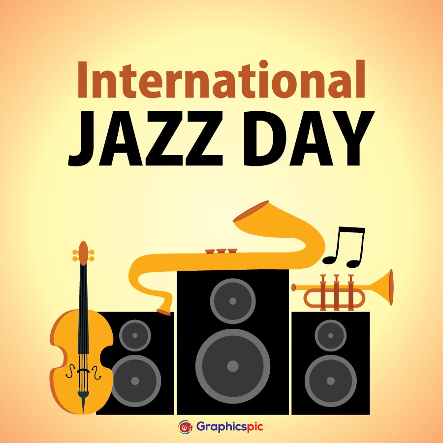 International Jazz Day with Musical instrument Saxophone, Trumpet, Cello, Guitar, Buffer Music, Sound Box