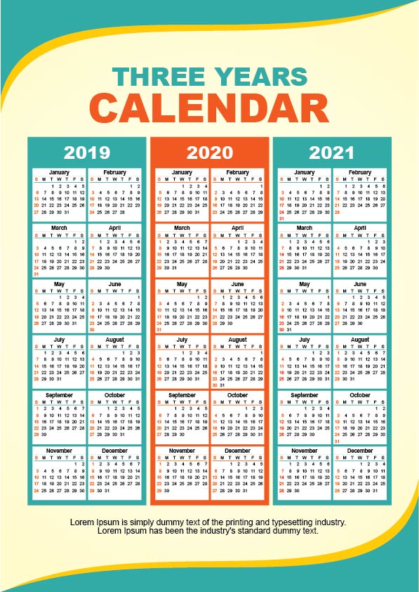 Three years 2019, 2020 & 2021 calendar design template with Super Modern, Creative and Corporate look. Calendar design are very easy to use and customize, so you can quickly tailor-make your Calendar for any opportunity. Use this Calendar template for company or corporate use.