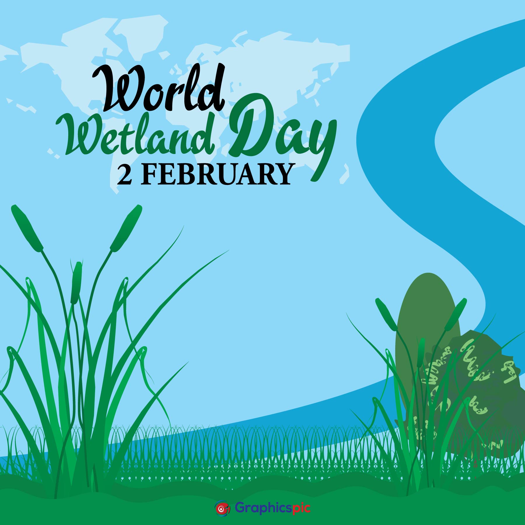 Vector illustration of World Wetlands Day theme. Postcard or banner with a map and the branches of reeds. The date of the event is 2 February