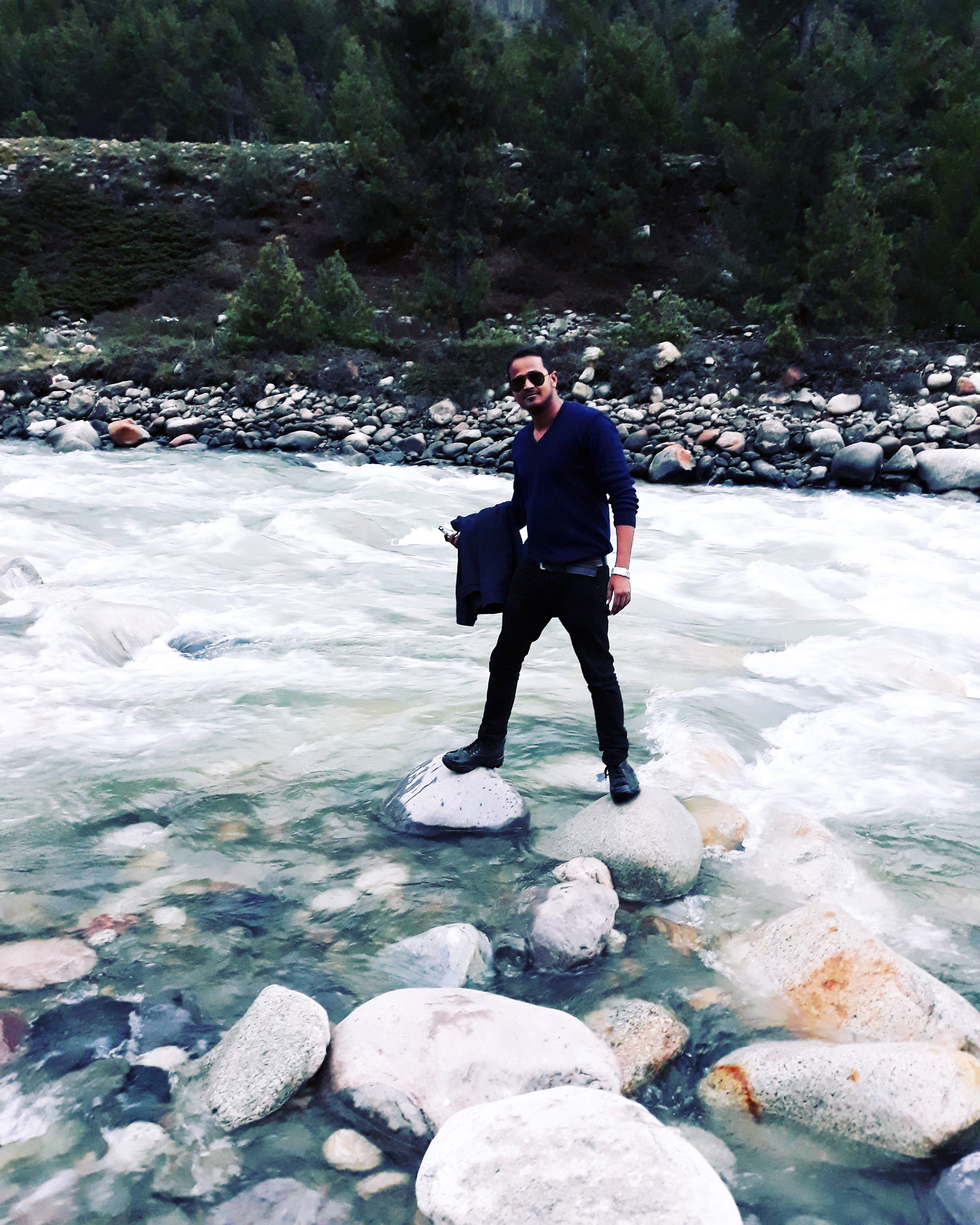 Young man in river & hilly area – free photo